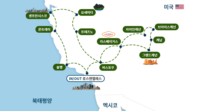 인천-로스앤젤레스(1)-바스토우/라스베이거스(1)-자이언/브라이스캐년/페이지(1)-그랜드캐년/라플린(1)-바스토우/차우칠라(1)-요세미티/샌프란시스코/프레몬트(1)-샌프란시스코/프레몬트(1)-몬트레이/솔뱅/로스앤젤레스(1)-인천
